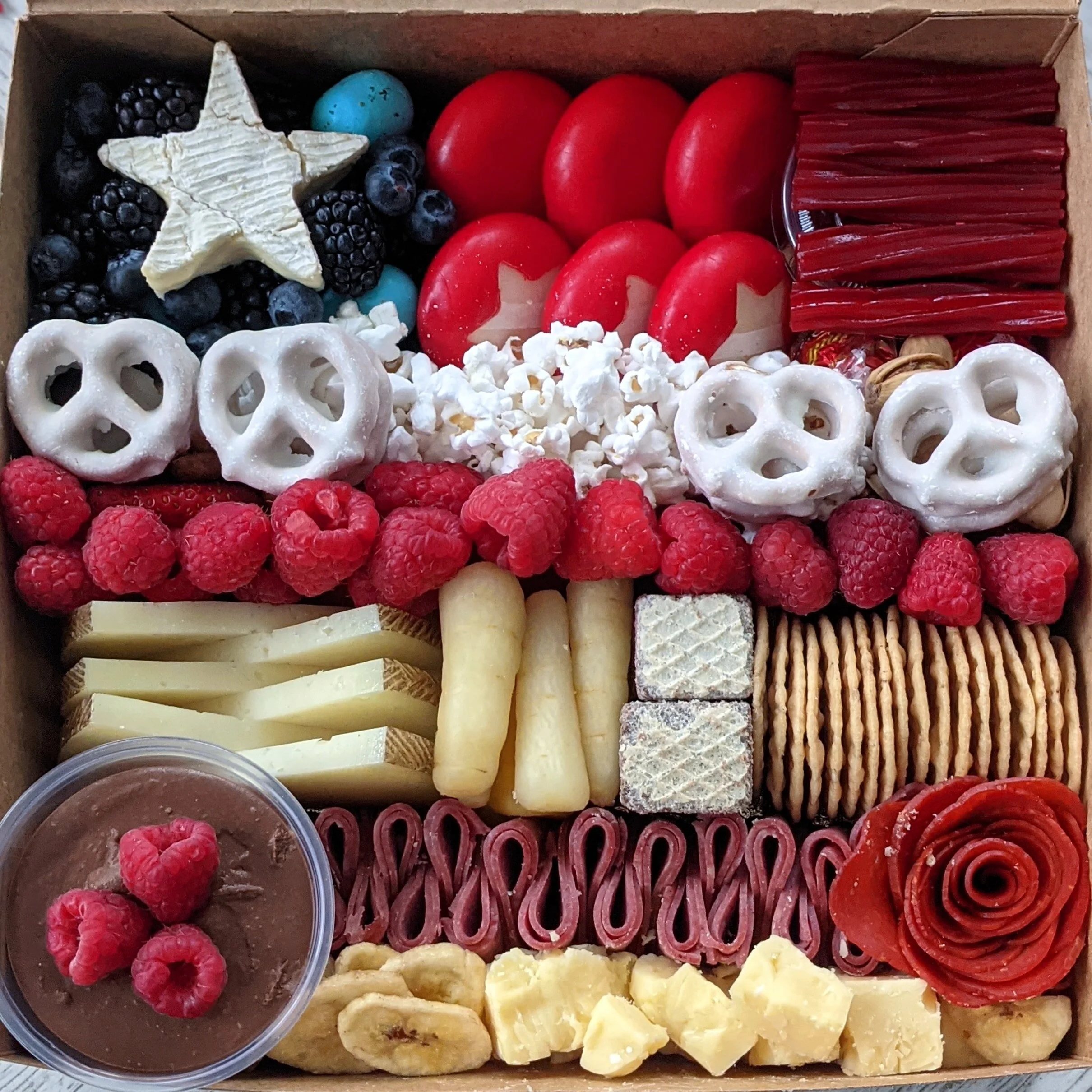 The Box feeds a generous appetizer for 4-6 people, the perfect answer for gifts, movie night, or girls night with the bestie. Our grazing artist customizes a delicious pairing of hummus and meats, cheeses, seasonal vegetables, fruit (fresh and/or dry), nuts, jelly or honey, and festive treats, sweets, olives and/or pickles. To encourage you to eat your veggies first, crackers are always served on the side. Bamboo tongs included.